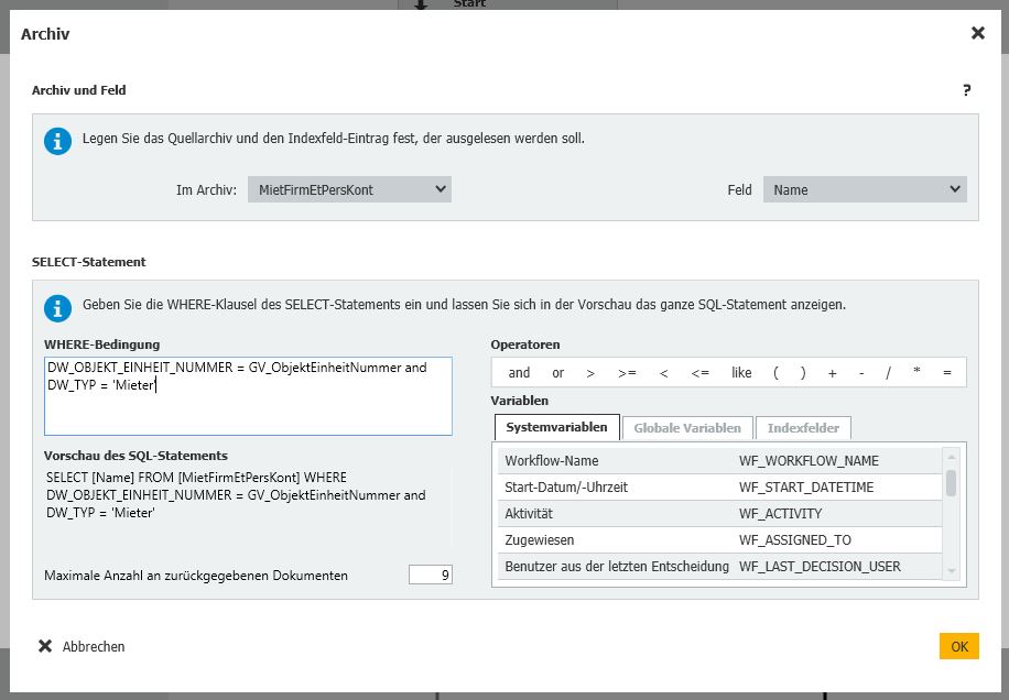 TOP 1 meint, dass unter dem WHERE-Feld ausgewählt wird, dass nur ein Dokument zurückgegeben wird. Das ist dann der Mieter mit der höchsten DocID, der ja wahrscheinlich auch der aktuelle Mieter ist.