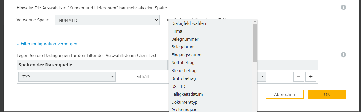 Sie sollten also zwei Auswahllisten haben, eine für Kunden und eine für Lieferanten, jeweils über den Typ gefiltert.<br>
