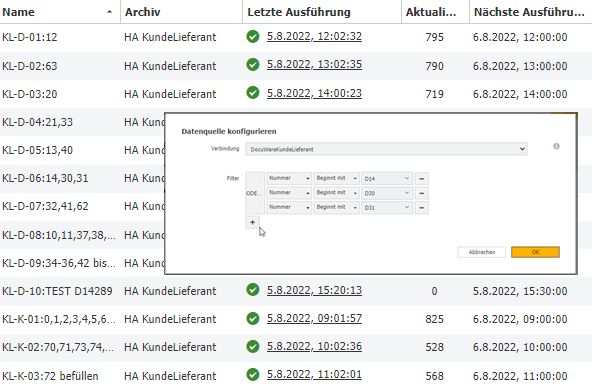 für verschiedene Auswahlliste fülle ich ein Hilfsarchiv mit externen Beständen. In der Datenquelle liegen ca. 10.000 Datensätze. Da über den Autoindex nur 1.000 Datensätze importiert werden können, wurden mehrere Autoindex-Jobs mit Filterregeln angelegt.