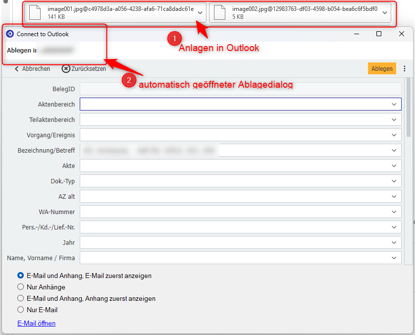 Jetzt haben wir erstmalig den Effekt gehabt, dass bei der Übergabe einer Mail mit Anlagen ein direkter Ablagedialog von DocuWare (siehe ScreenShot) geöffnet wurde.
