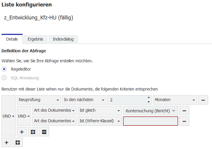 Ich möchte jetzt in Archiv1 eine Liste generieren, die nur Dokument der Fahrzeuge der Abteilung XY enthält.