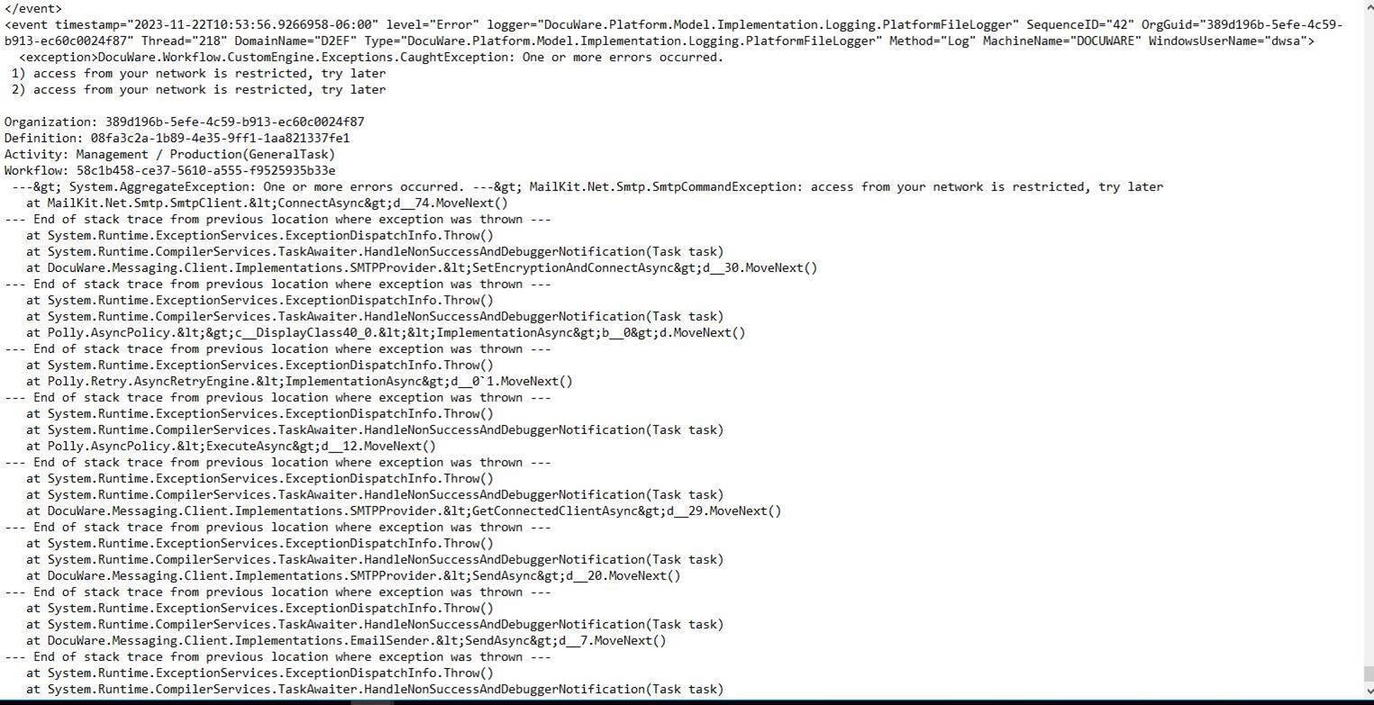 It is an SMTP issue. It may well be something on our side or it could be something with our provider or it could be a unique circumstance with DocuWare itself. What we need is a DocuWare expert that can help diagnose and explain where the breakdown is occurring and offer options to resolve. I can look at the logs all day but I am not manufacturer of the product and I do not possess the skills or information to completely understand what it happening. I am 100% sure there is somebody at DocuWare that can look at this issue and understand where the problem lies and how to resolve it. I can provide any and all information about our systems and configuration.