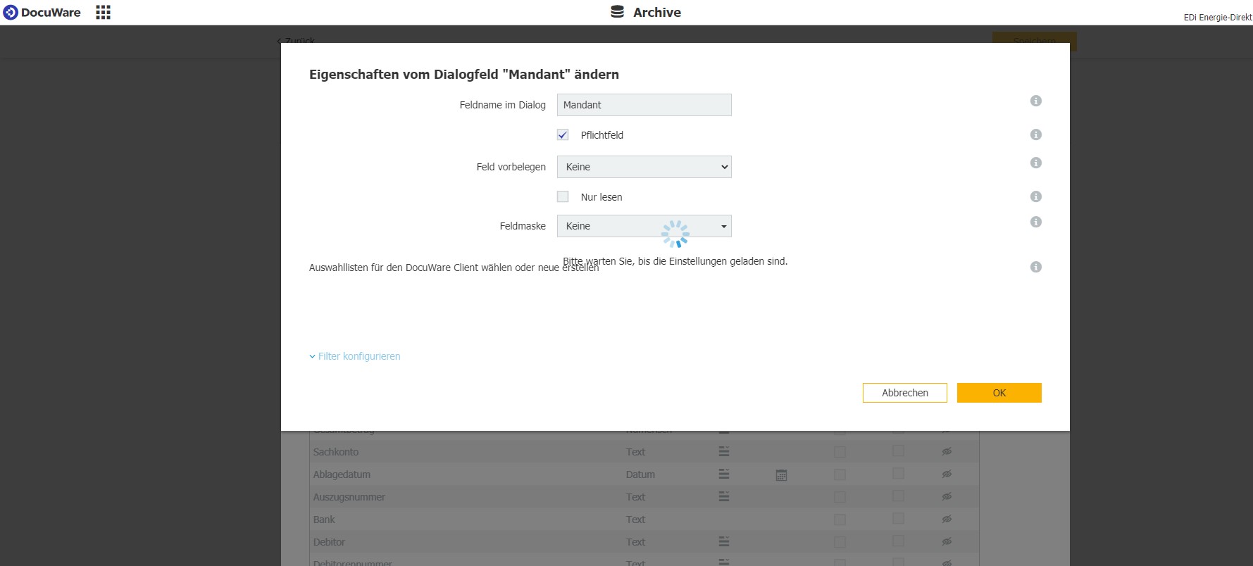 seit dem Update auf 7.3 unserer OnPremise Installation kann ich die Eigenschaften eines Dialogfelds bei der Archivkonfiguration nicht mehr ändern. Beim Klick auf das gewünschte Feld öffnet sich zwar das Fenster, dort dreht sich jedoch nur der blaue Kreis endlos und es kann nichts ausgewählt werden (Screenshot anbei). Ist jemandem dieses Phänomen bekannt und kann helfen?