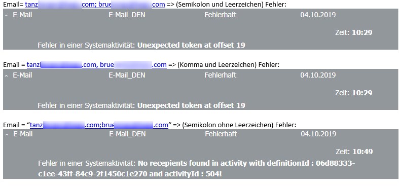 Nun ist es so das im ERP System im "Feld E-Mail Adresse" auch mehrere E-Mail Adressen per Semikolon getrennt vorkommen können (nicht muss). Wenn der Workflow nun an der Aktivität "E-Mail Versenden" angelangt und mehrere E-Mail Adressen in der Workflow Variable drin stehen kommt ein entsprechender Fehler der aber nicht sonderlich aufschlussreich ist. Es gibt zudem Unterschiede bei der Trennung von E-Mail Adressen, zum Beispiel wenn sie per Komma getrennt sind.