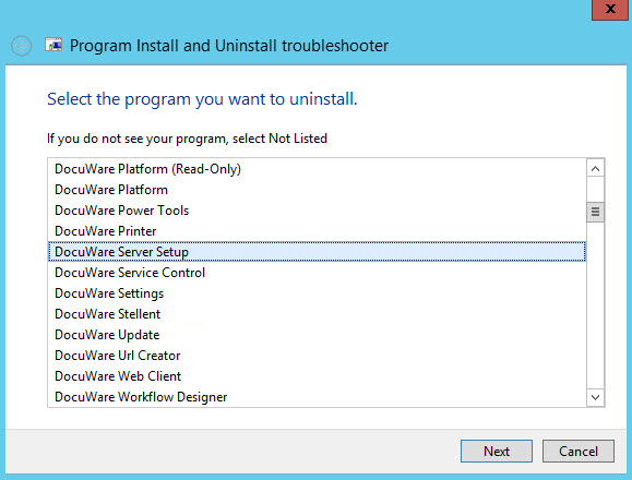 Download and run the Fixit for "Uninstalling" and remove any DocuWare items that are still there after the uninstall (see pic for how they will appear).