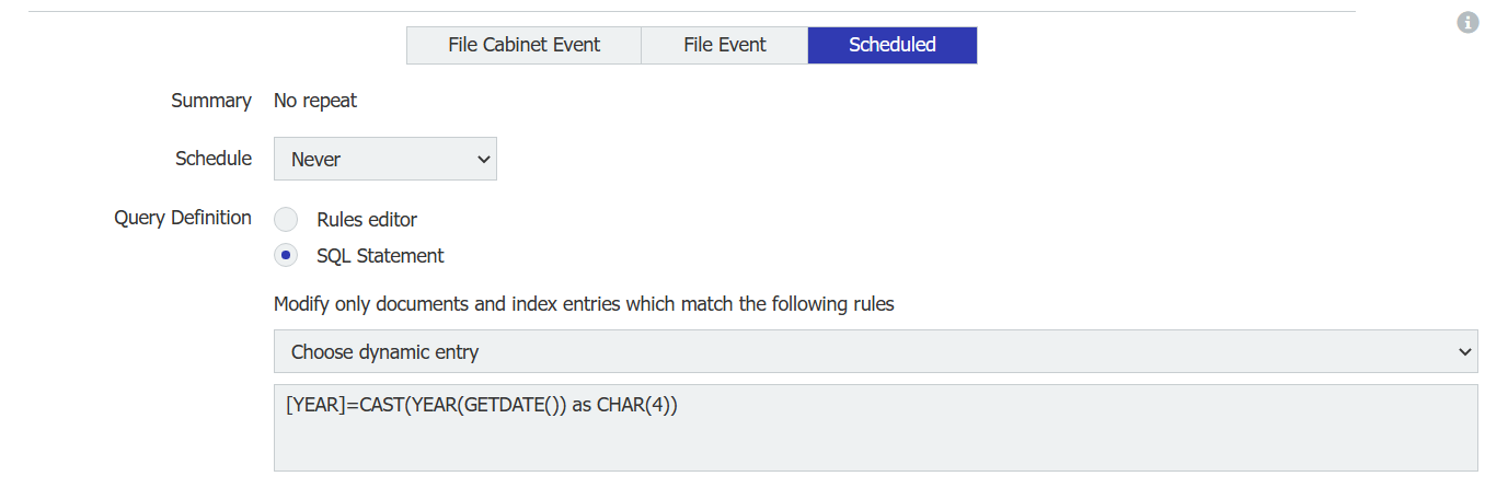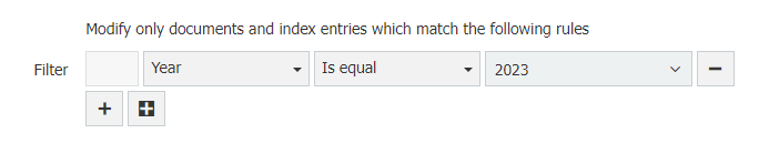 I need to create records in one file cabinet for a set of record from another cabinet, this must be done automatically once a year. The new records include a text field called year, I set a filter in the Trigger tab of Autoindex as in the screenshot, it's works perfectly. Now I want to make the year value dynamic based on the current date at the time of execution, is it possible to do that?