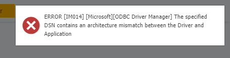 Please delete your ODBC data source and create a new one using a 64-Bit ODBC driver, then the issue should be resolved.