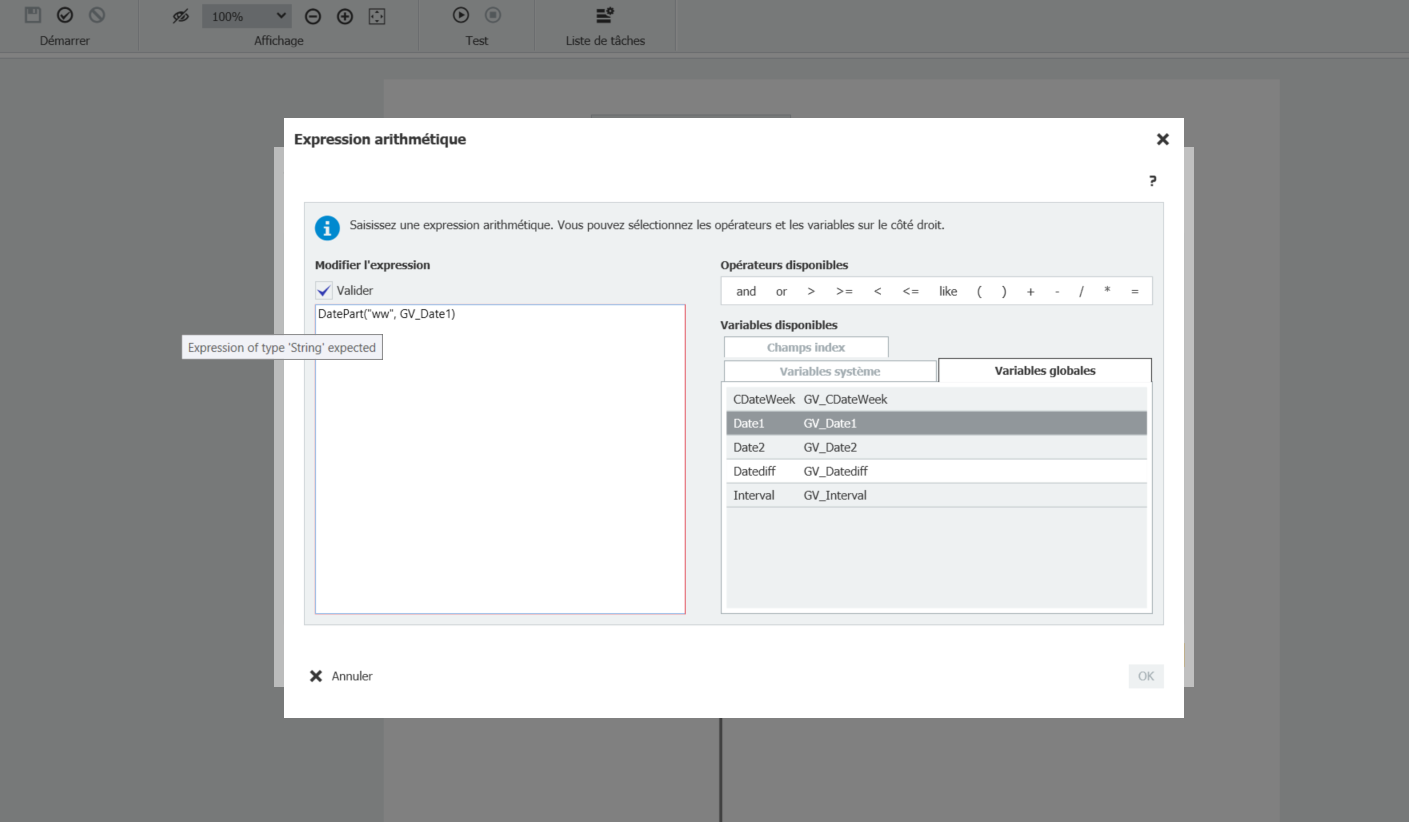 Hi&#160;Vorawooth,<br> <br> you are almost there. The DatePart() function returns a Variant (Integer). That means you can write the returned value to a field/variable of type &quot;numeric&quot; in DocuWare Workflows.<br> <br> I suppose you are trying to write to a field/variable of type &quot;text&quot;. For this you need to convert the returned value to a string using CStr().<br> So the expression looks like this:&#160;<code>CStr(DatePart(&quot;ww&quot;, GV_Date1))</code><br> <br> <br> Viele Grüße / With best regards,<br> --<br> Gerardo Lisanti<br> Product Manager &#160;| &#160;DocuWare GmbH