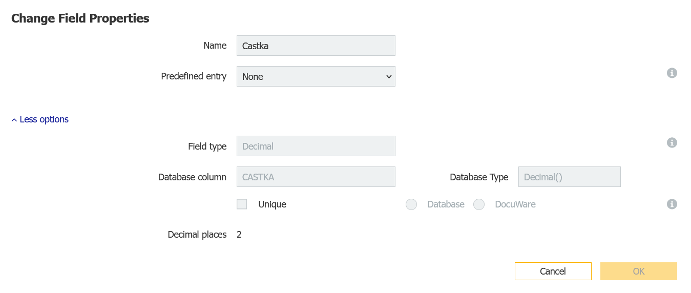 <Field dbName="Castka" type="Decimal" culture="cs-CZ" decimalPlaces="2" value="64544,56" />
