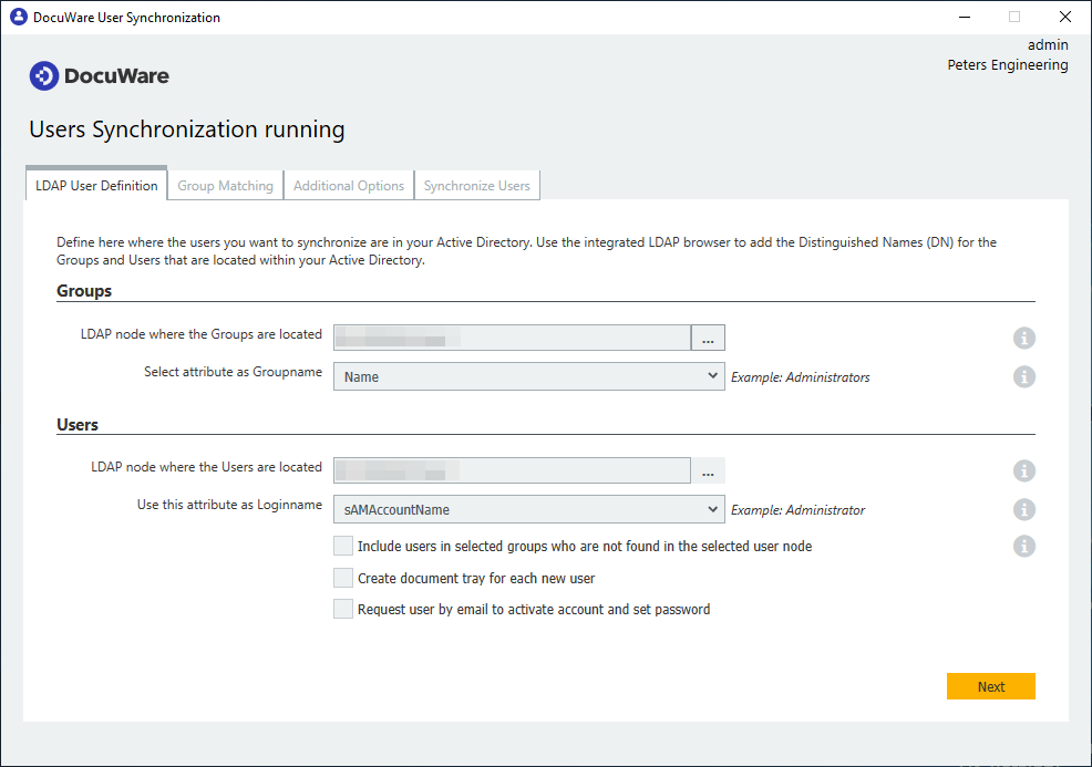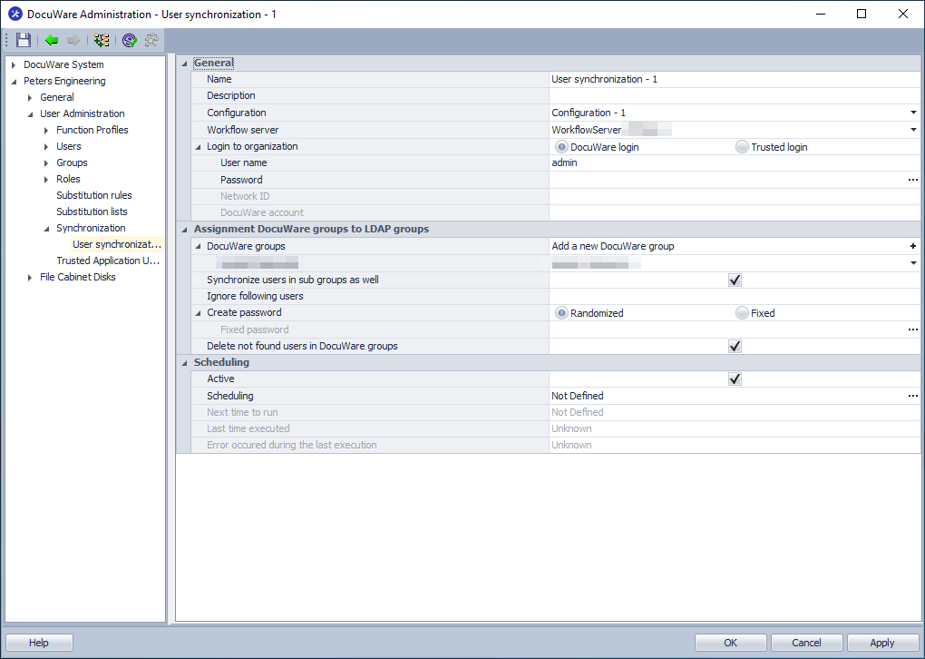Which User Synchronization are you using? The integrated one in DocuWare Administration, referred to as User Sync V1, or the standalone Desktop App, referred to as V2. See screenshots below: