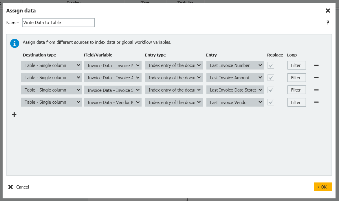 According to what I read here ;https://docuware.uservoice.com/forums/230570-client-english/suggestions/38934235-include-the-ability-to-write-to-table-fields-autom. we should be able to load table fields automatically in a workflow using the Assign Data activity. I have tried it to no avail. The configuration looks correct and there are no errors or faults in the workflow. The table is simply not written to and the document history for this step simply says "Variable is empty"
