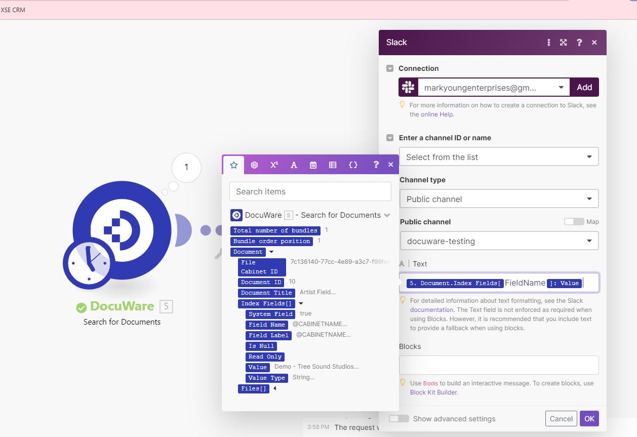 Can anyone give me guidance on pulling index data with the DocuWare module in make.com? I am trying to put the contents of an index field into a Slack text message but can't figure out what block or code to drop into the text editor. The attached picture represents my best guess but it is not working.